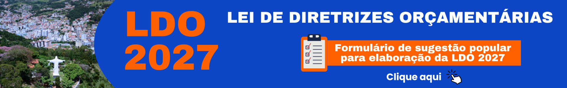 PARTICIPE! O FORMULÁRIO DE SUGESTÃO POPULAR PARA A ELABORAÇÃO DA LDO 2027 JÁ ESTÁ DISPONÍVEL!PARTICIPE! O FORMULÁRIO DE SUGESTÃO POPULAR PARA A ELABORAÇÃO DA LDO 2027 JÁ ESTÁ DISPO 23 de março