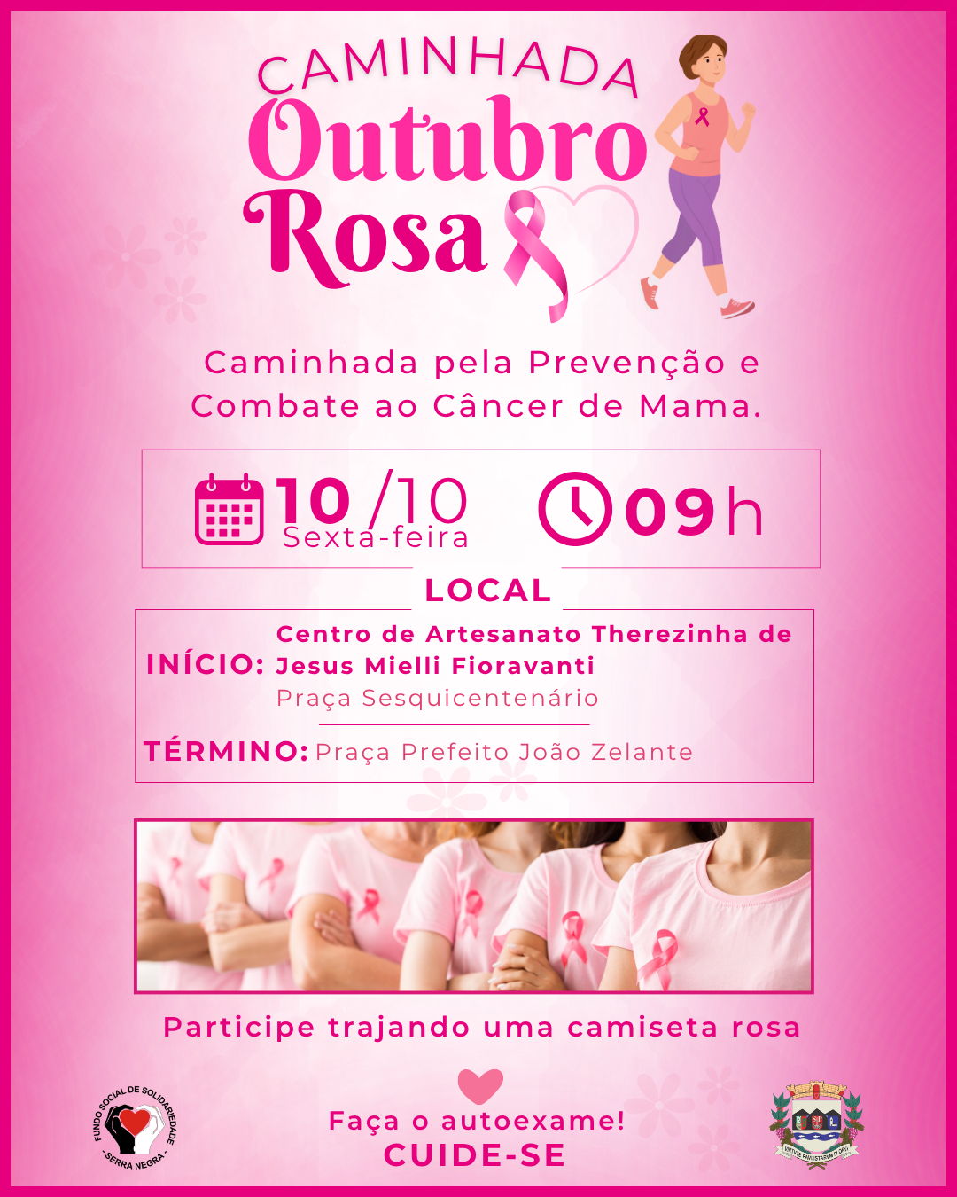 No dia 10 de outubro, às 9h, o Fundo Social de Solidariedade realiza a Caminhada Outubro Rosa, com saída do Centro de Artesanato Therezinha de Jesus Mielli Fioravanti, na Praça Sesquicentenário, e encerramento na Praça Prefeito João Zelante.