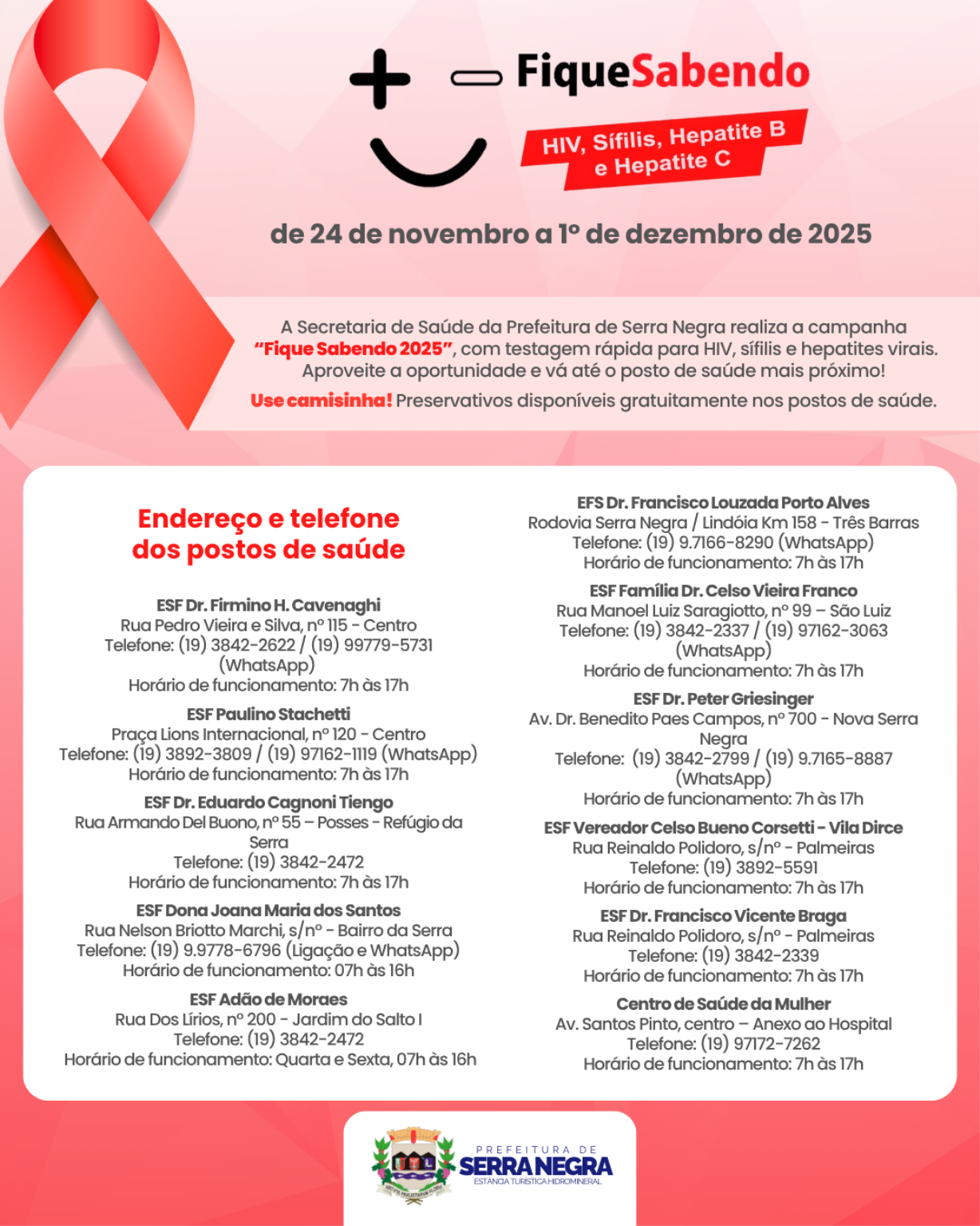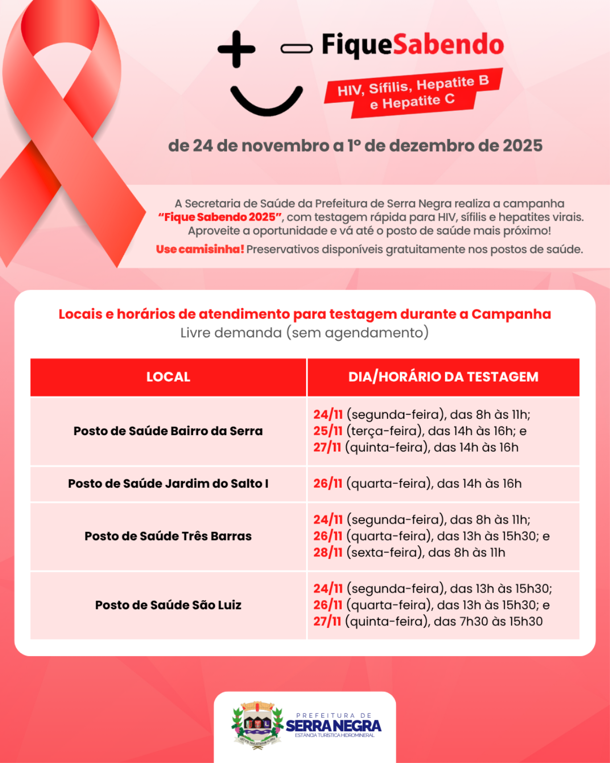 De 24 de novembro a 1º de dezembro, os postos de saúde de Serra Negra realizarão testagem rápida para HIV, sífilis e hepatites virais. O resultado sai em cerca de 20 minutos, com total sigilo e segurança.