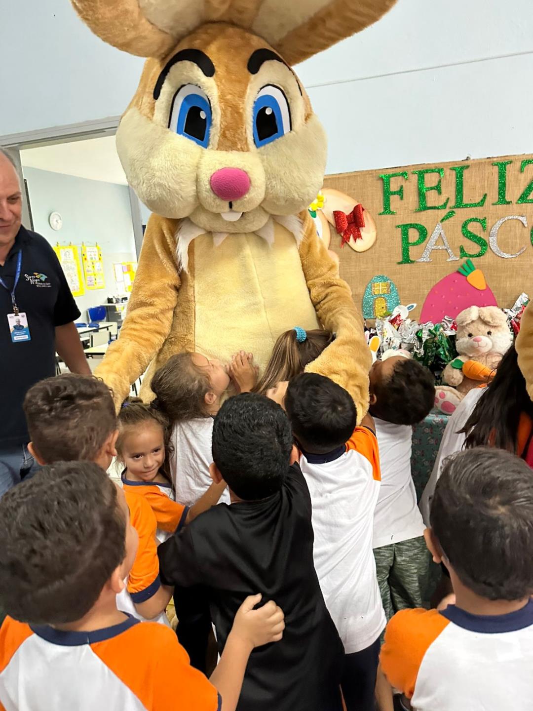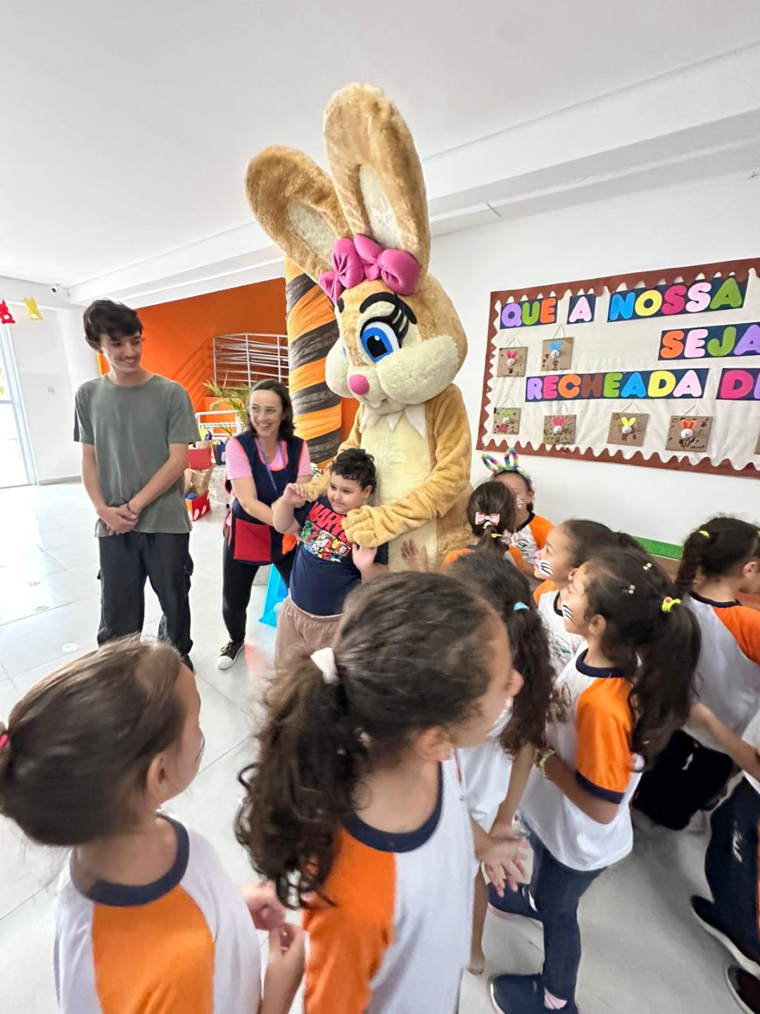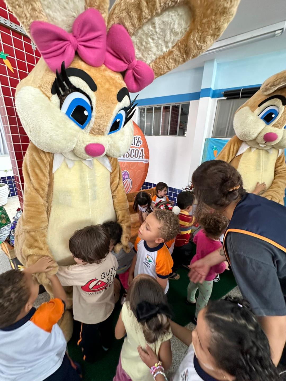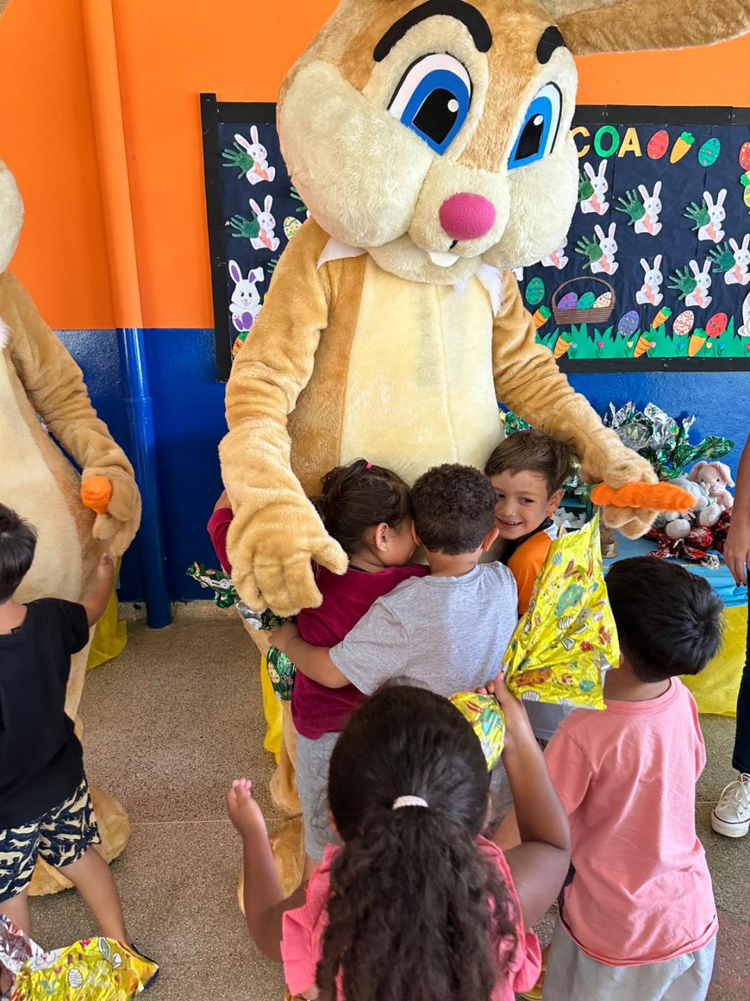 A equipe visitou todas as unidades da Rede Municipal de Ensino, incluindo também turmas da Educação de Jovens e Adultos (EJA), acompanhada por coelhos da Páscoa, que levaram muita alegria a todos.