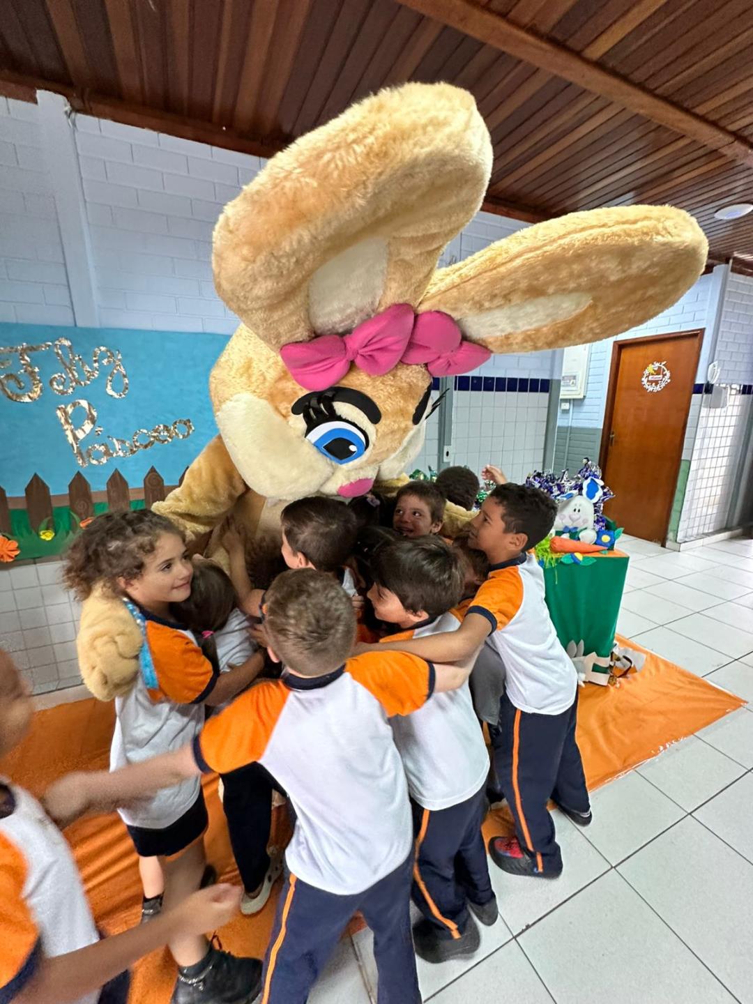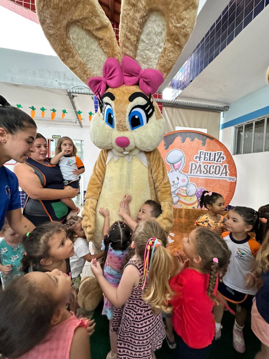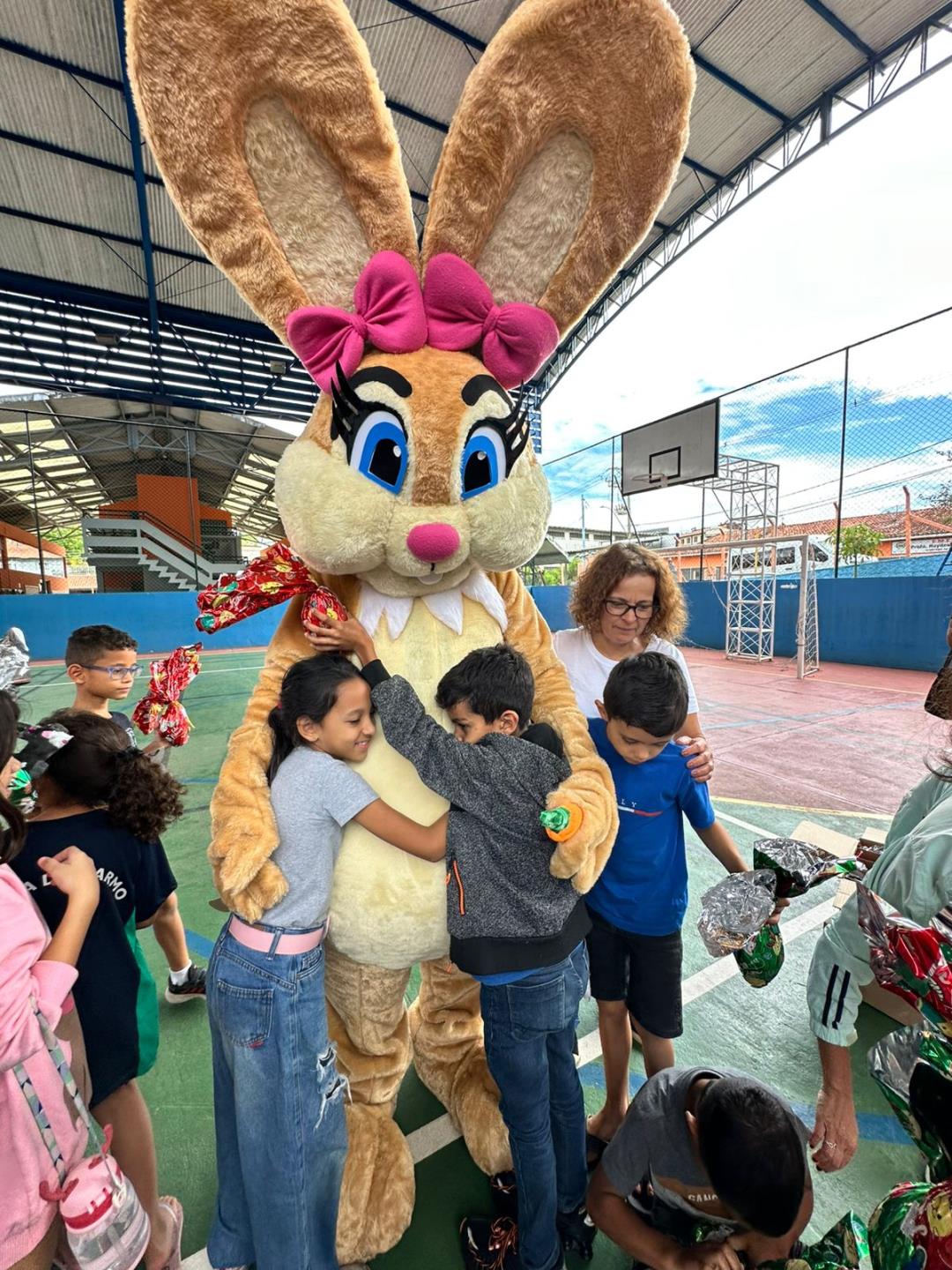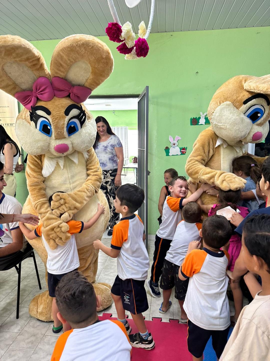 A equipe visitou todas as unidades da Rede Municipal de Ensino, incluindo também turmas da Educação de Jovens e Adultos (EJA), acompanhada por coelhos da Páscoa, que levaram muita alegria a todos.