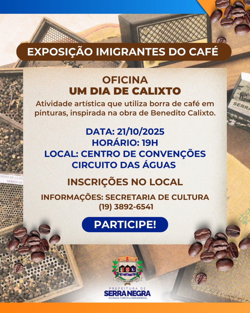Até o dia 31/10 | Segunda a sexta, 8h às 17h, no Centro de Convenções Circuito das Águas – Rua Nossa Senhora do Rosário, 630 – Serra Negra/SP