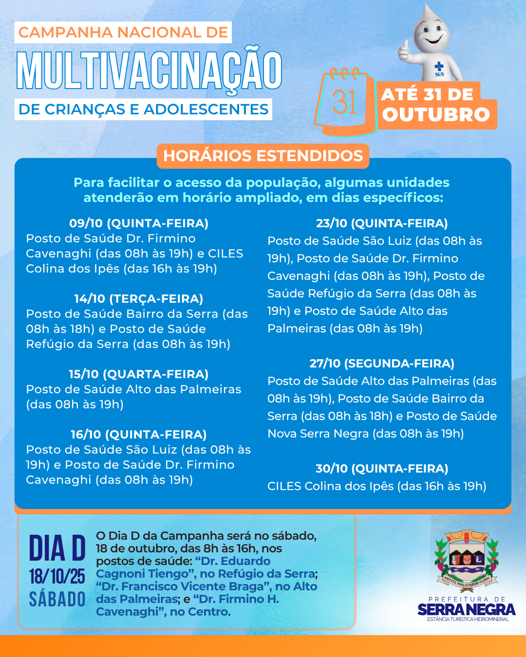 O Dia D da Campanha será no sábado, 18 de outubro, das 8h às 16h, nos postos de saúde: “Dr. Eduardo Cagnoni Tiengo”, no Refúgio da Serra; “Dr. Francisco Vicente Braga”, no Alto das Palmeiras; e “Dr. Firmino H. Cavenaghi”, no Centro.