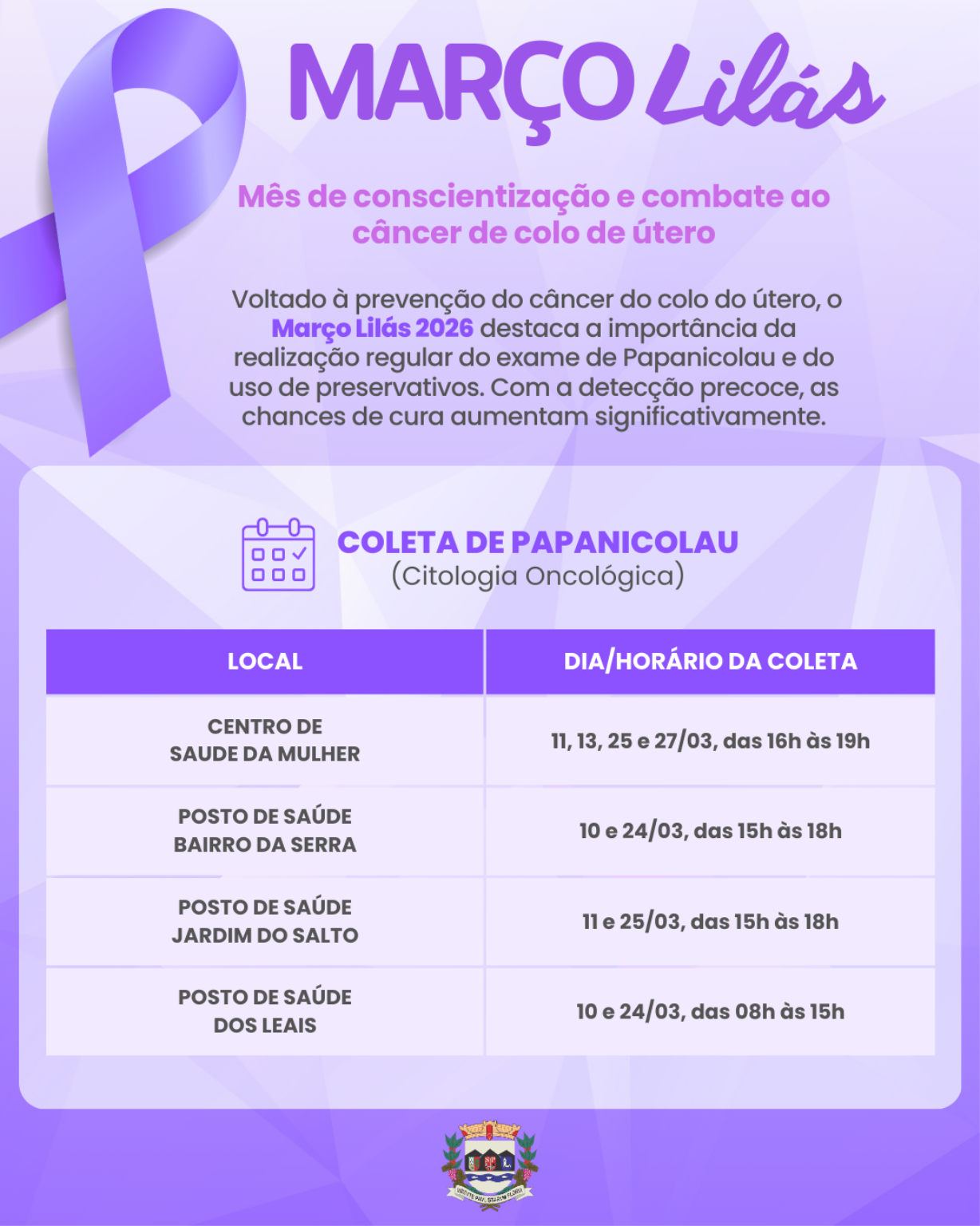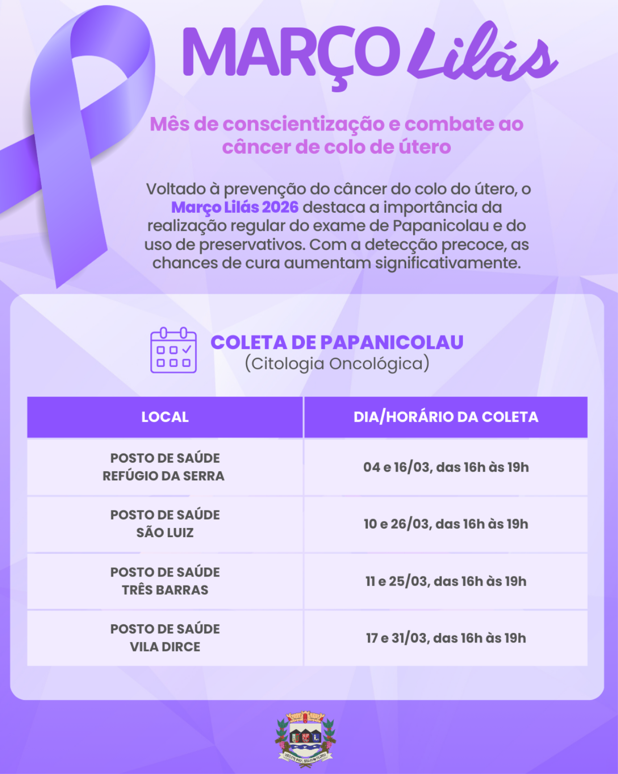 A Prefeitura de Serra Negra realiza, durante todo o mês de março de 2026, ações de prevenção ao câncer do colo do útero nas unidades de saúde do município. A campanha Março Lilás amplia o acesso ao exame preventivo Papanicolau, estende horários de atendimento e intensifica orientações à população, com o objetivo de promover o diagnóstico precoce e reduzir a incidência da doença.