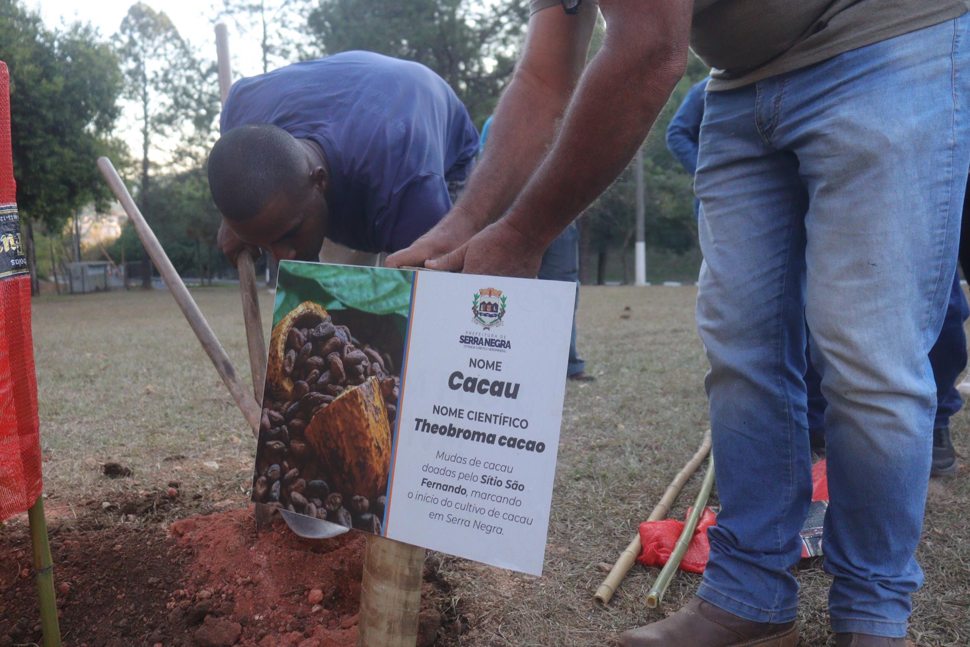 A agricultura sempre foi um dos pilares da economia de Serra Negra, destacando-se pela produção de café, hortifrutigranjeiros, flores, queijos, vinhos e cachaças artesanais que colocam o município entre os mais tradicionais do Circuito das Águas Paulista. Agora, um novo capítulo começa a ser escrito com o plantio de mudas de cacau, doadas pelo Sítio São Fernando, realizado nesta quarta-feira (17) na área externa do Centro Administrativo Municipal Prefeito Jesus Adib Abi Chedid.