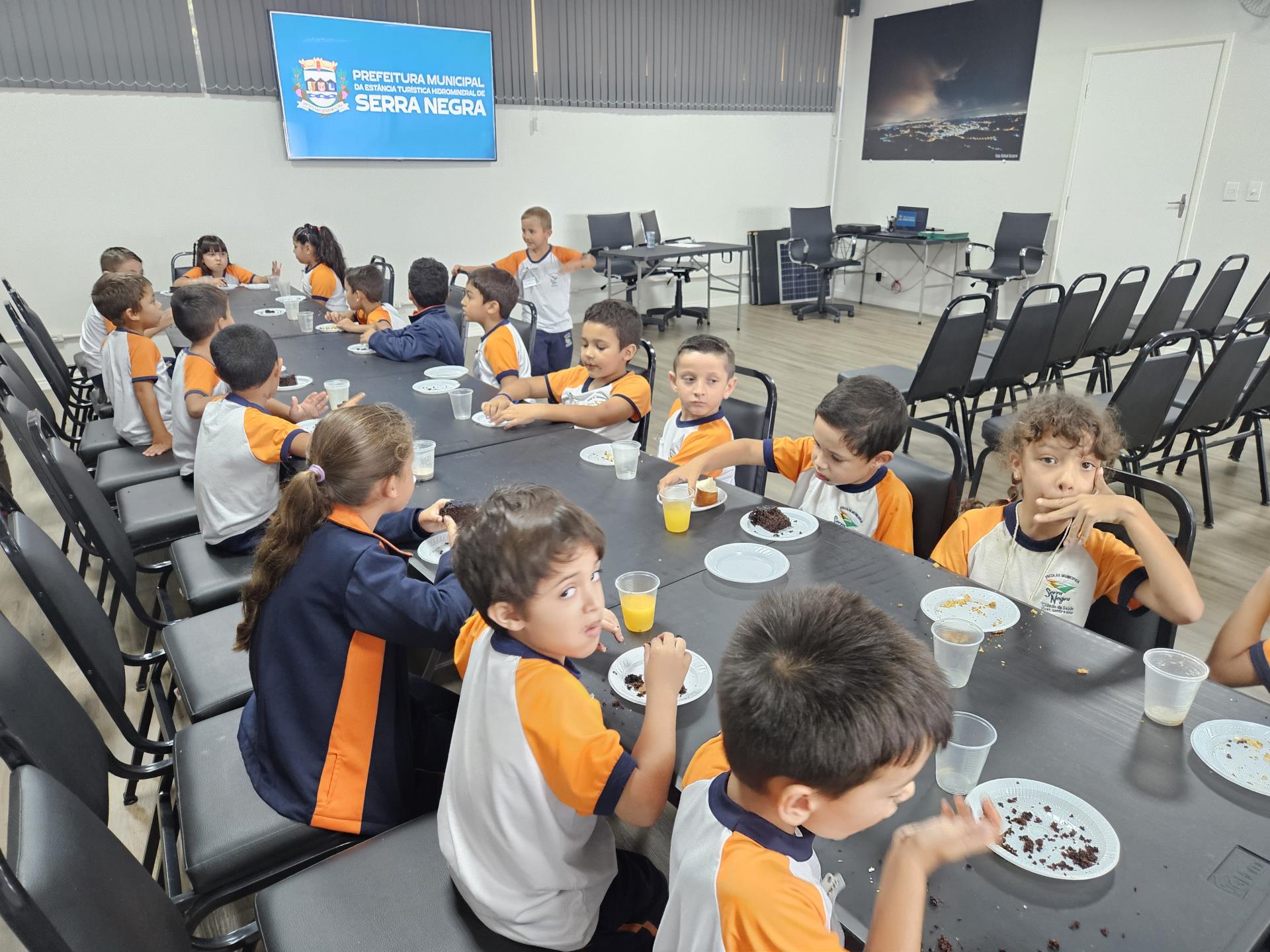 Durante as visitas, os alunos percorreram setores da Prefeitura e ao final cada criança ganhou um quebra-cabeça da Fontana di Trevi, símbolo turístico de Serra Negra, e um lanche especial, tornando a experiência educativa e lúdica.