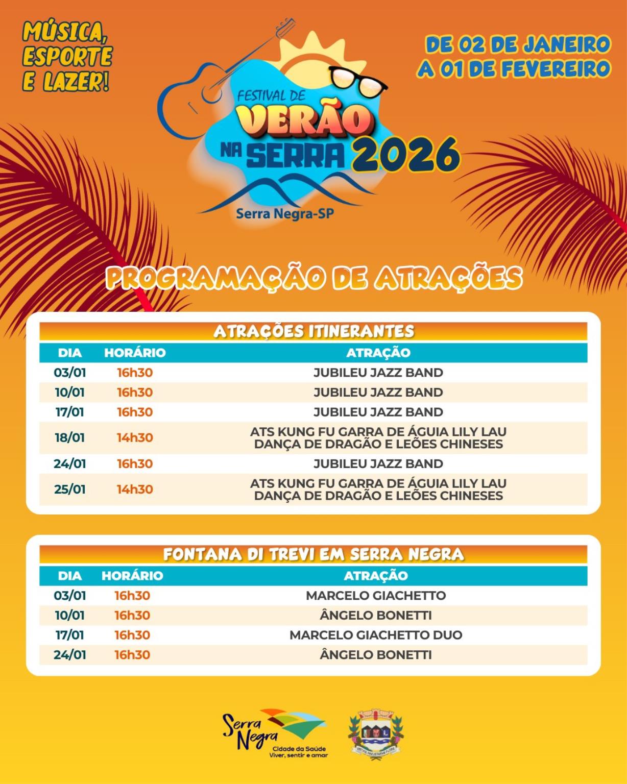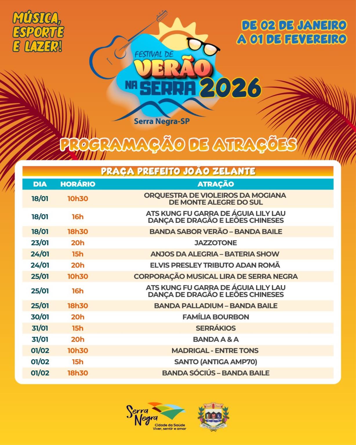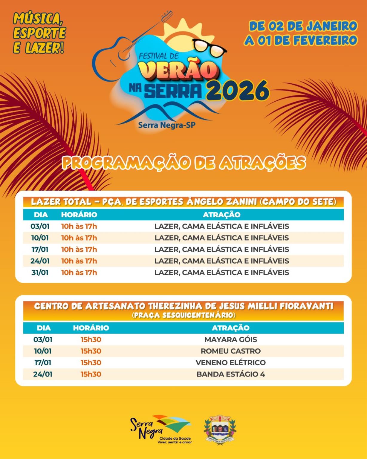Serra Negra vive mais uma temporada especial com o Festival de Verão 2025, que acontece de 2 de janeiro a 1º de fevereiro, reunindo música, arte, cultura e lazer em diferentes pontos da cidade.