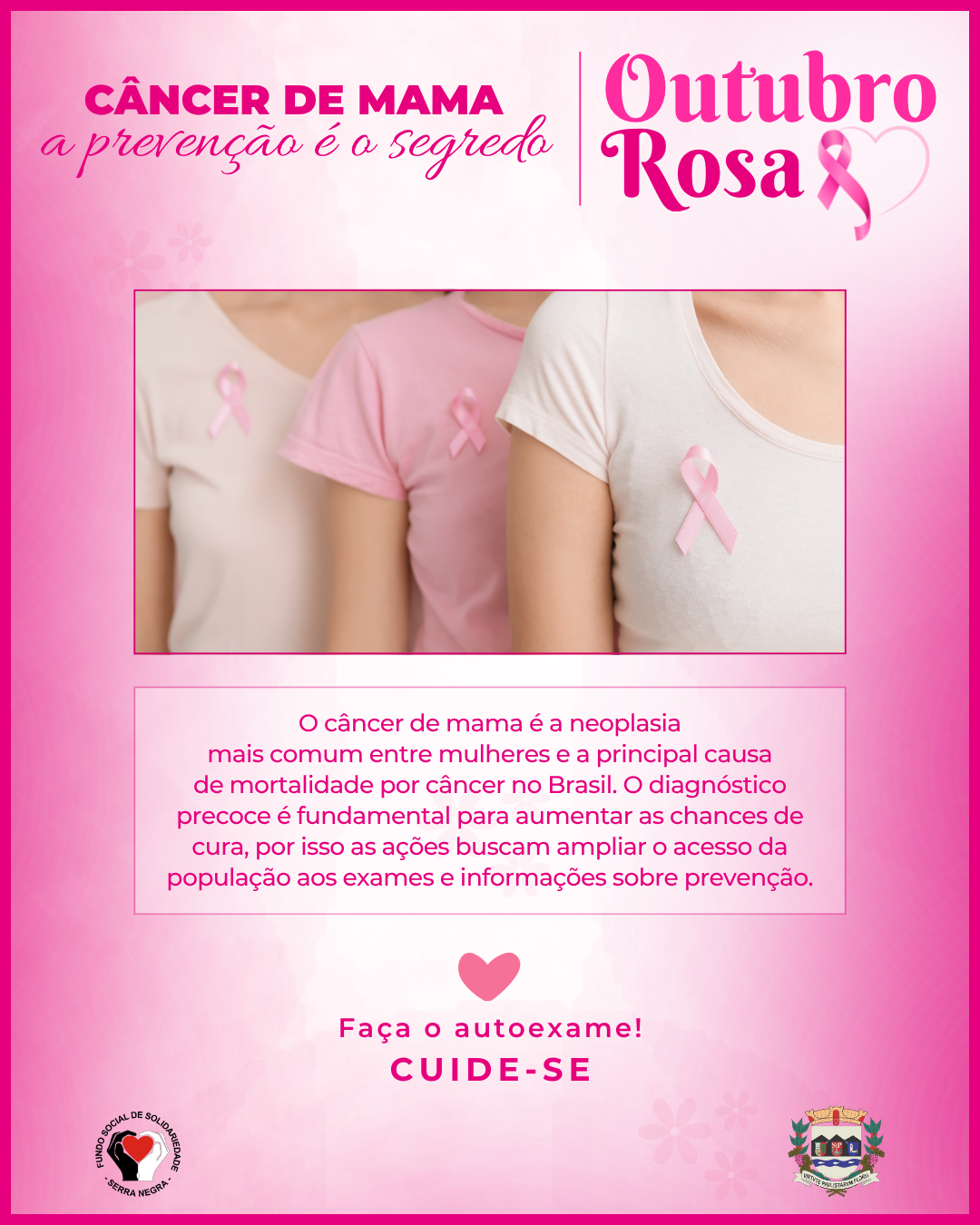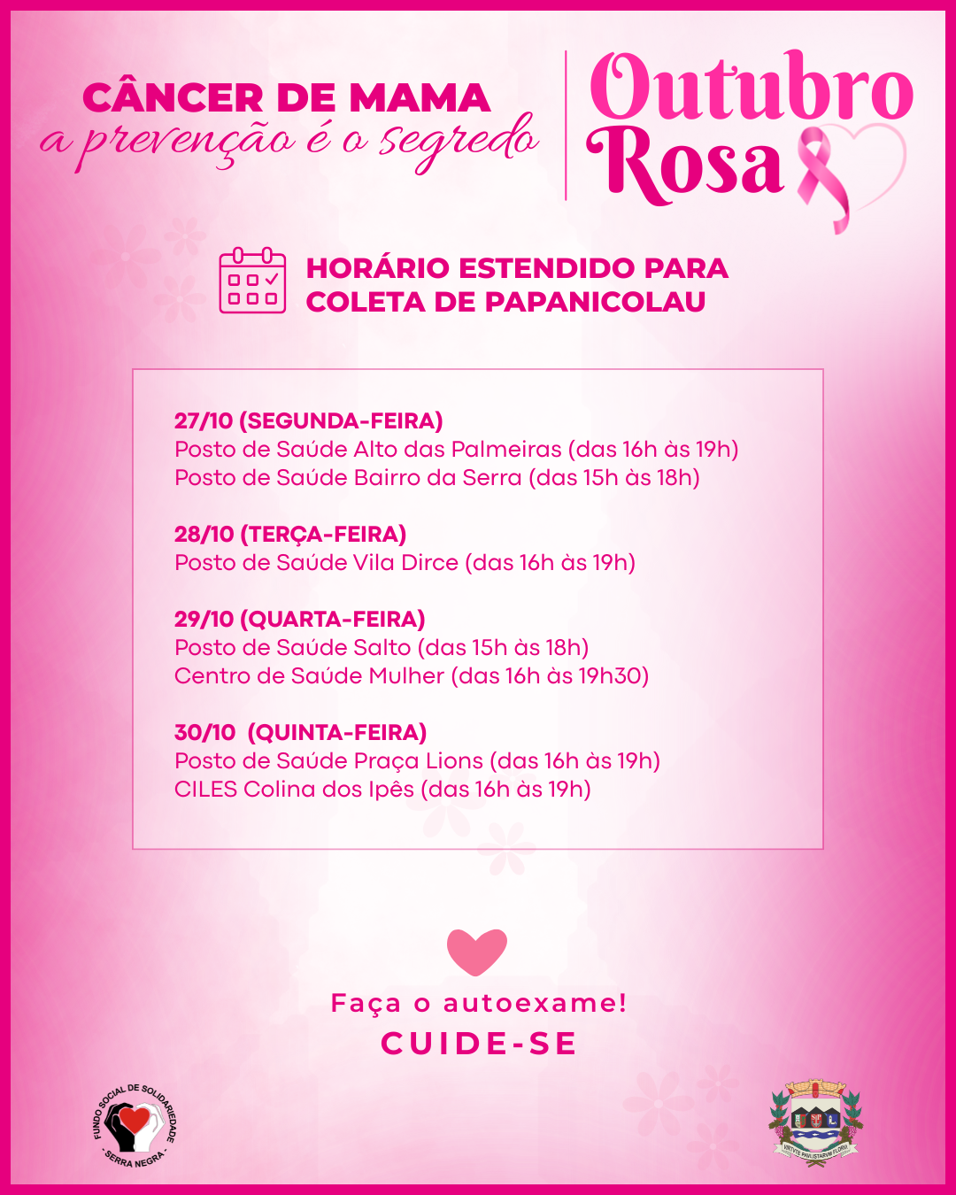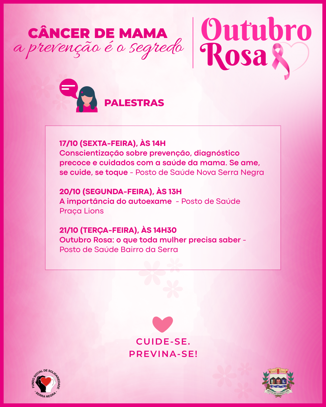 - 17/10 (sexta-feira), às 14h - Conscientização sobre prevenção, diagnóstico precoce e cuidados com a saúde da mama. Se Ame, Se Cuide, Se Toque – Posto de Saúde Nova Serra Negra