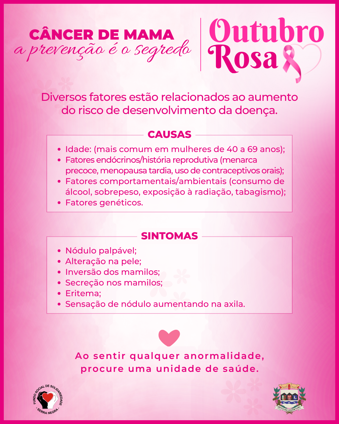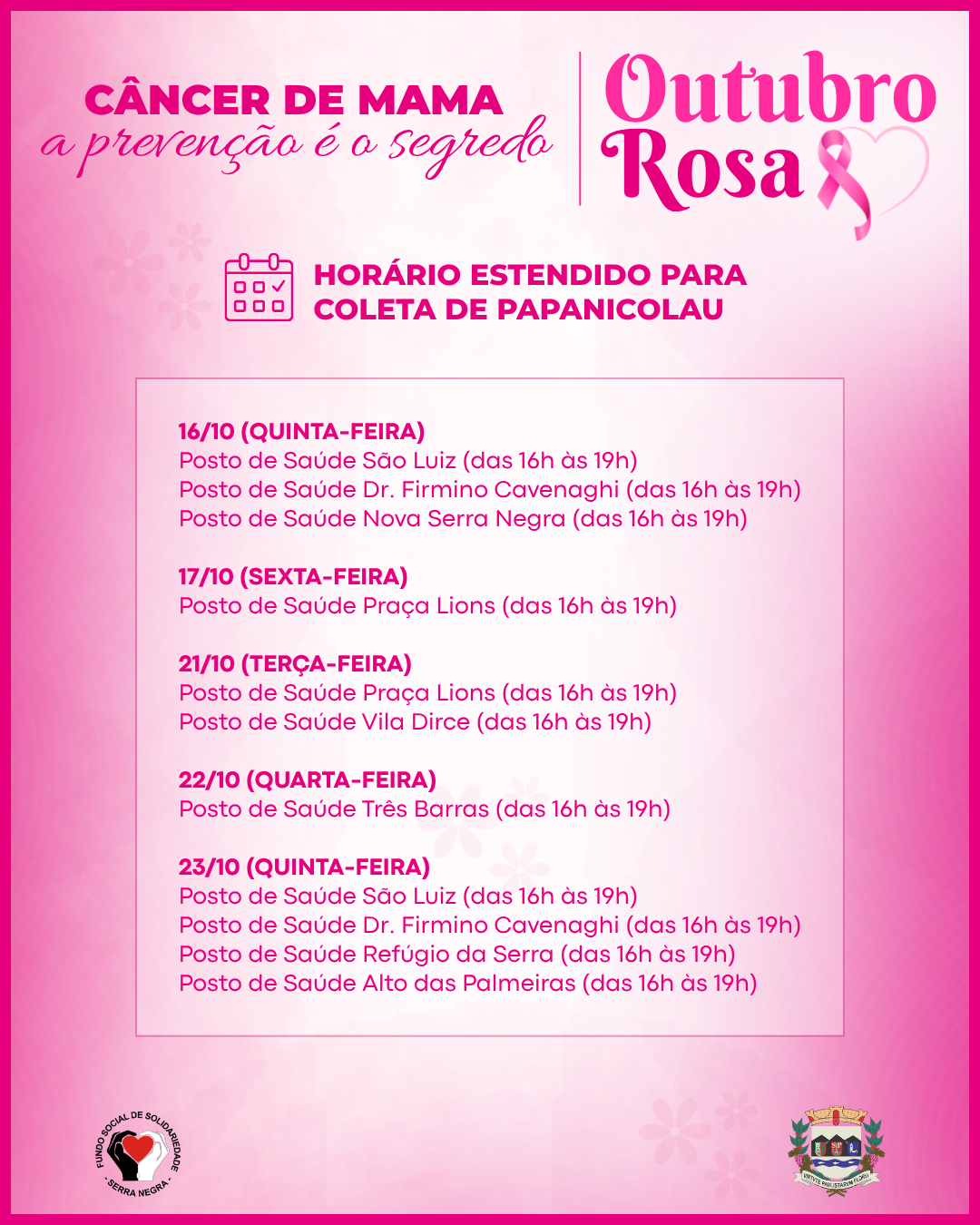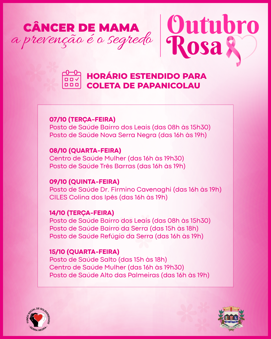 - 17/10 (sexta-feira), às 14h - Conscientização sobre prevenção, diagnóstico precoce e cuidados com a saúde da mama. Se Ame, Se Cuide, Se Toque – Posto de Saúde Nova Serra Negra