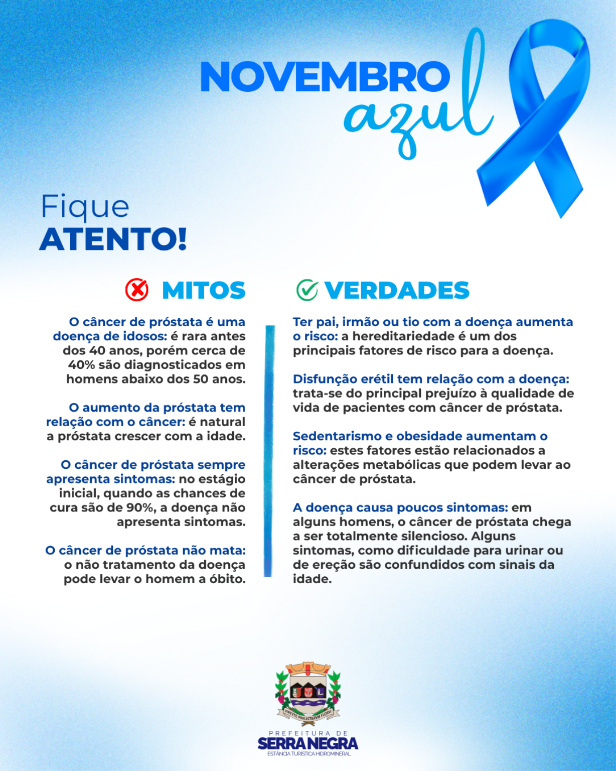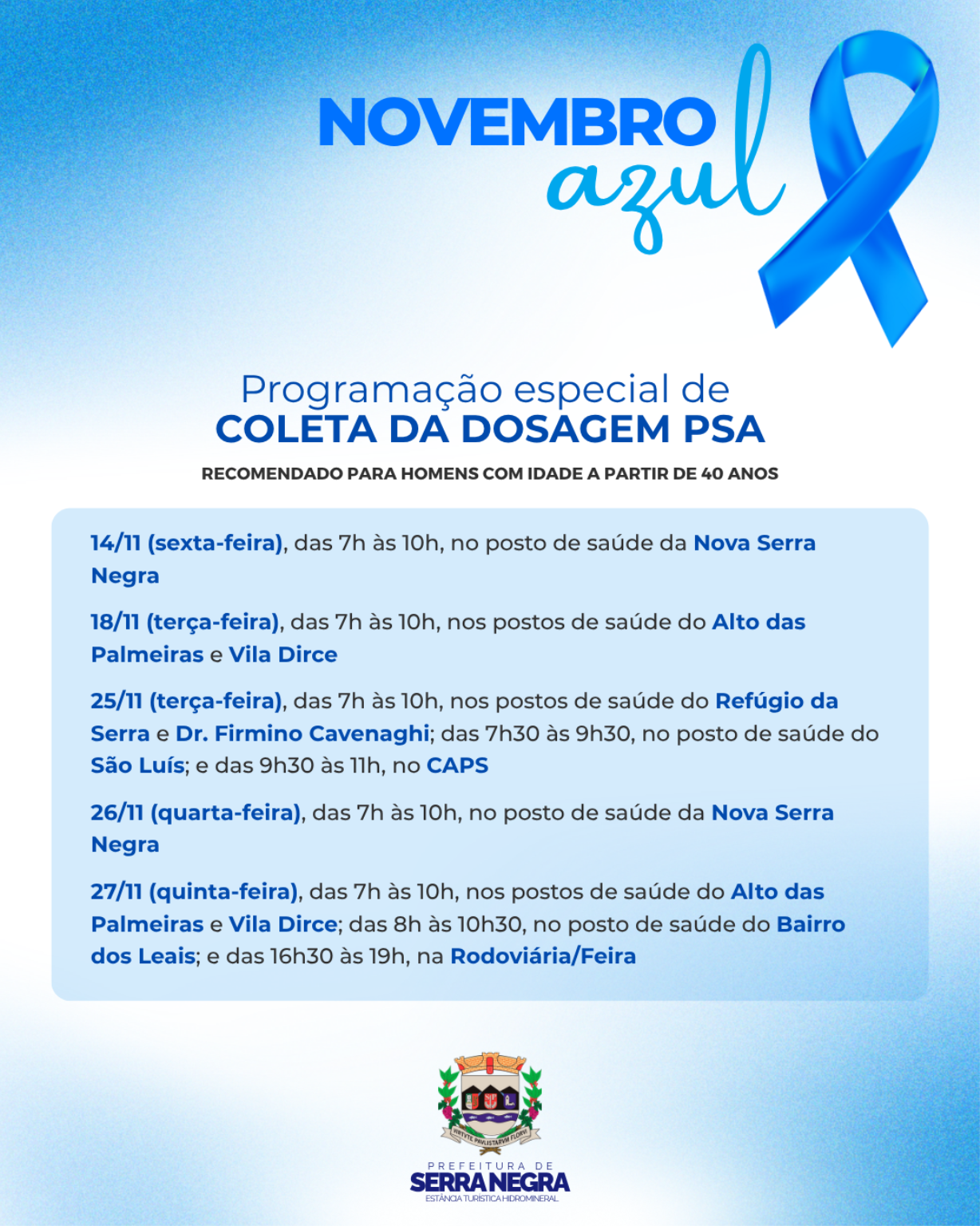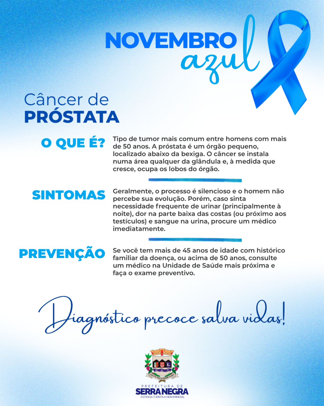 A Prefeitura de Serra Negra, por meio da Secretaria Municipal de Saúde, realiza durante todo o mês de novembro, a Campanha Novembro Azul 2025, com ações voltadas à prevenção, diagnóstico precoce e promoção da saúde do homem.